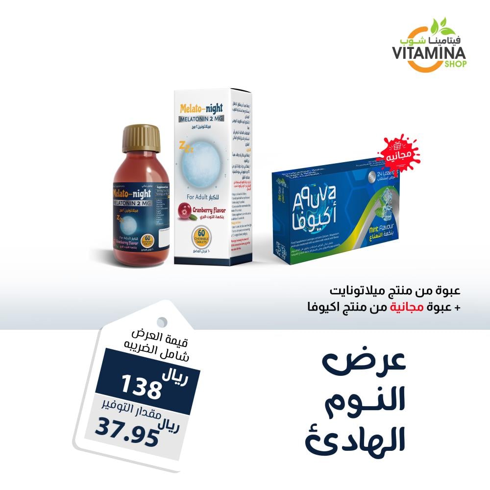 احصل على عبوة من منتج ميلاتونايت يحتوي على ميلاتونين 2 مجم أقراص مضغ بطعم التوت اللذيذ والذي يساهم في التقليل من الوقت المستغرق للخلود للنوم، مع عبوة مجانية من منتج أكيوفا والذي يساهم في الوظائف الطبيعية لأنزيمات الهضم أقراص مضغ بطعم النعناع . اجمع بين الفوائد الطبيعية وراحة البال في باقة واحدة مثالية لكل من يبحث عن نوم هادئ وصحي.